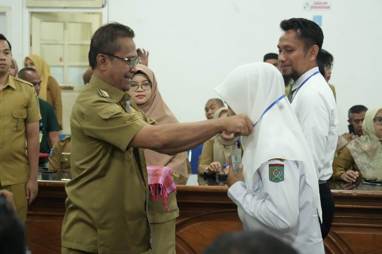 Sebagai tanda dimulainya kegiatan, Wakil Wali Kota Bima secara simbolis memasangkan tanda peserta kepada dua perwakilan peserta Diklat PPK Tipe C.
